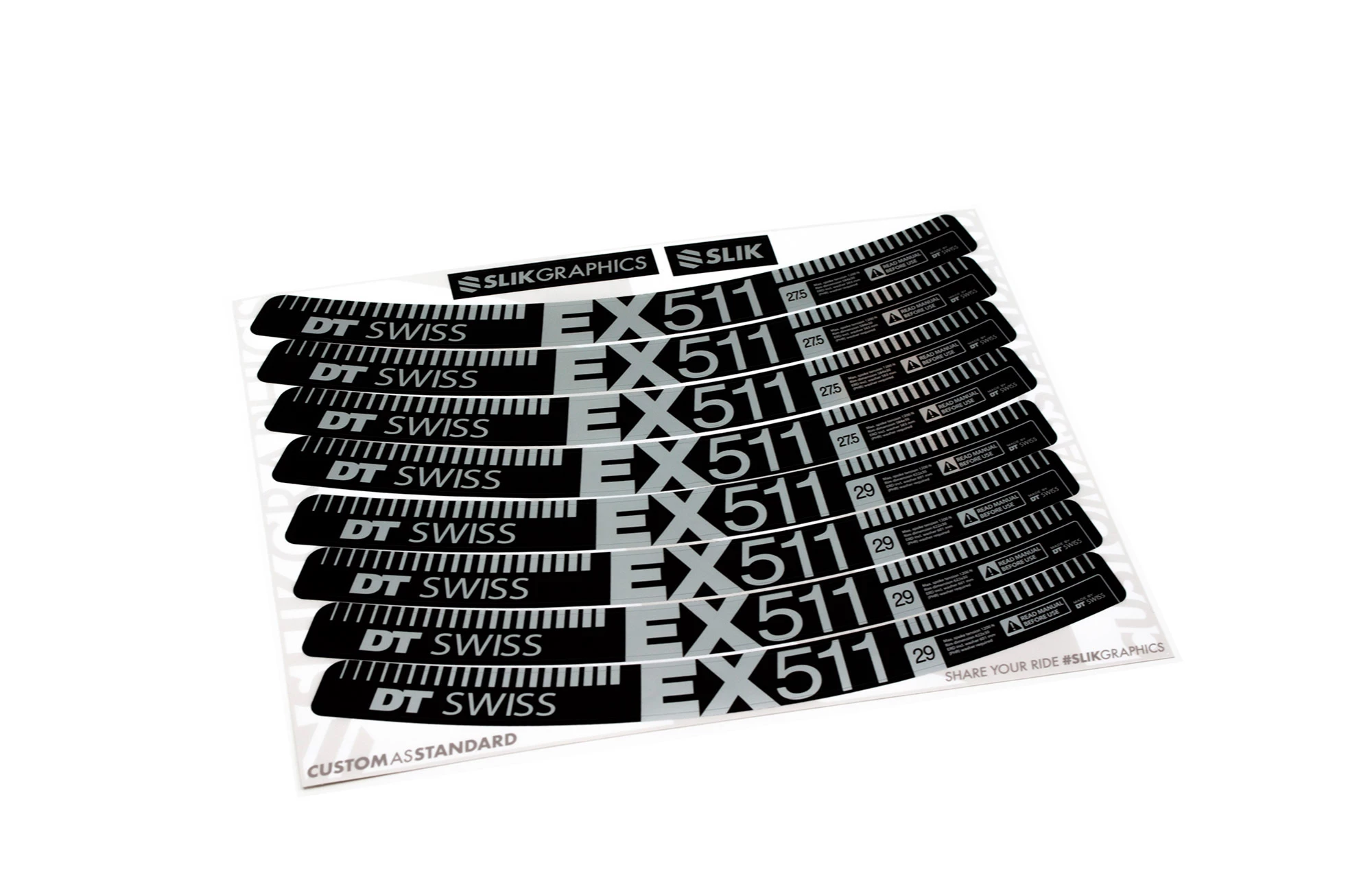 - |Description| Ce kit de stickers SLIK GRAPHICS permet de personnaliser vos jantes DT SWISS EX 511 et lesassortir à votre bike et vos composants. Il est muni de 8 stickers (2 de chaque côté des jantes à lavant et à larrière). Ce kit est disponible en version 29, 27,5 et mullet.Facile à coller, vous devez cependant bien nettoyer vos jantes avant de les poser. Conseil pratique, mettez des repères avant de décoller les anciens stickers et regardez toujours si vous êtes aligné au sticker se trouvant de lautre côté de la jante pour ne pas avoir à décoller.Spécifications techniques : Pour jantes EX 511 27.5 / 29 8 stickers Couleur : Silver Matt Taille : 255 X 15mm